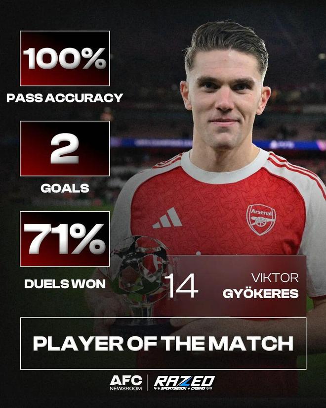 作为中锋,他的价值远不止于进球:7次地面对抗赢下5次,完成3次解围、2次球权回收和1次成功铲断,攻防两端存在感拉满。赛后,欧足联技术观察小组将全场最佳颁给了约克雷斯,并表示:“他凭借全场的出色表现获得这一奖项。他作为球队锋线的第一道防线积极逼抢,完美地引领了球队的进攻线,还展现出了出色的护球能力。他的努力付出得到了回报,收获了两个进球。”